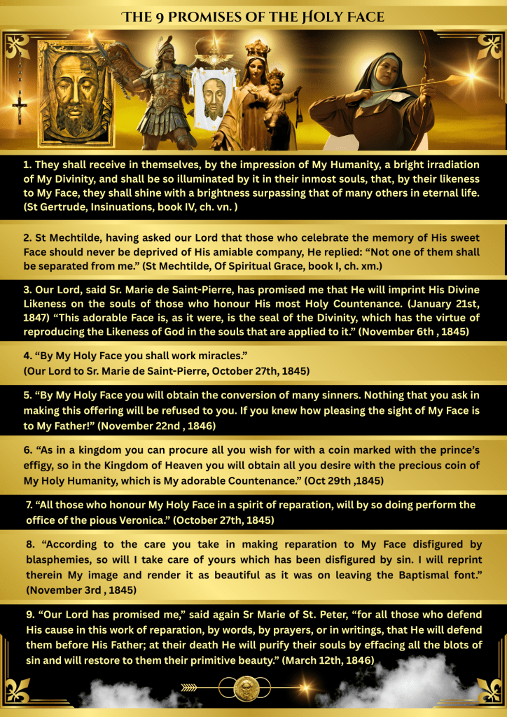 There are 9 promises of the Holy Face Devotion given by Jesus to Sister Marie of St. Peter during the Holy Face Devotion revelations in the 1840s, and to Blessed Mother Maria Pierina de Michelli in 1936, who is associated with the Holy Face Medal.