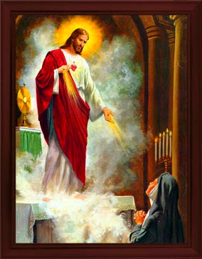 She described that His Heart was on fire and surrounded by a crown of thorns. Our Lord told her that the flames represented His love for humanity, and the thorns represented man’s sinfulness and ingratitude.