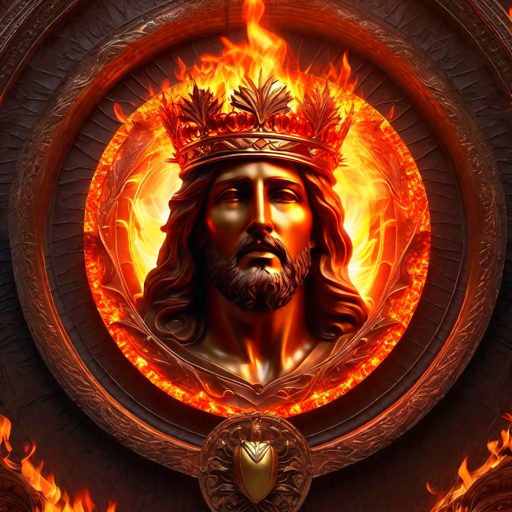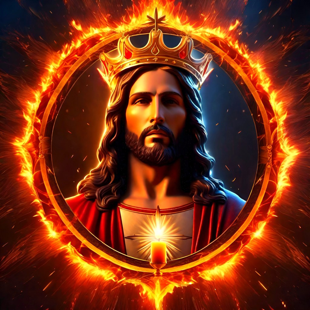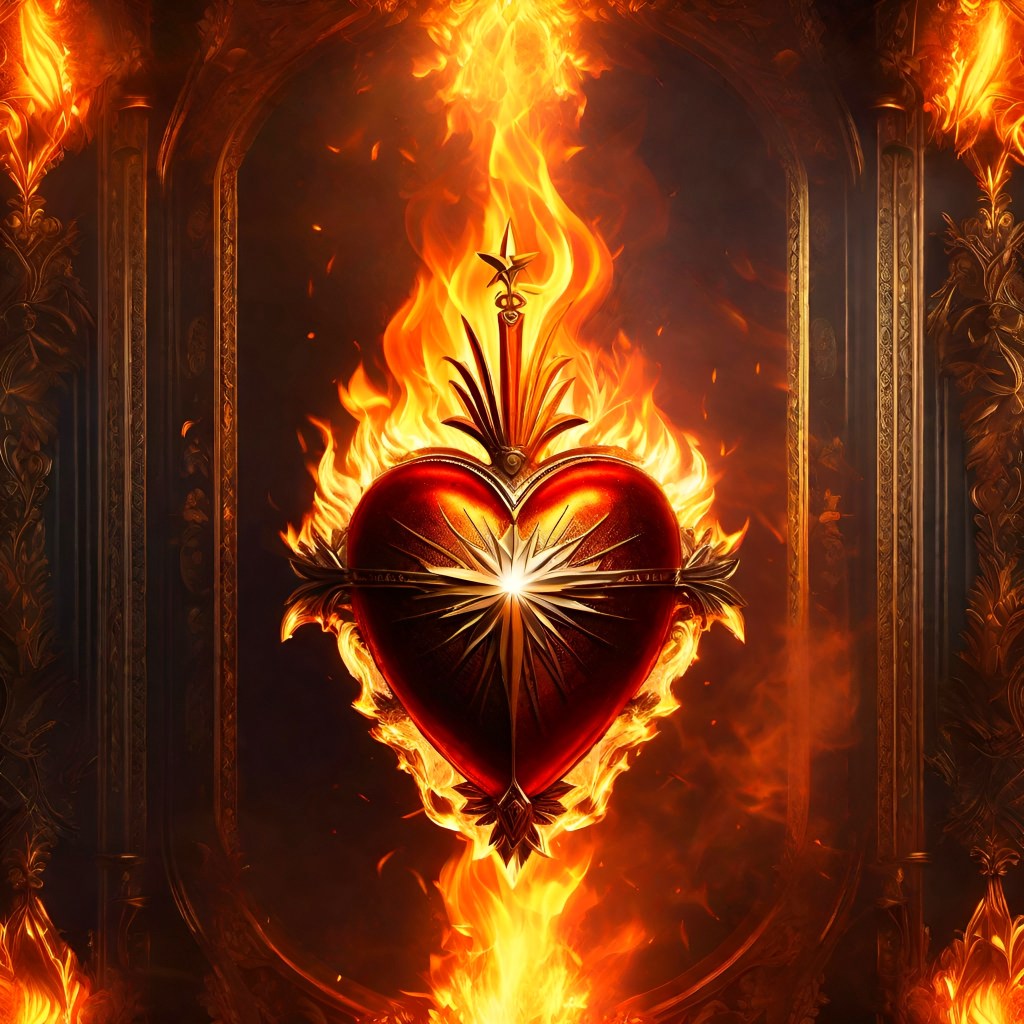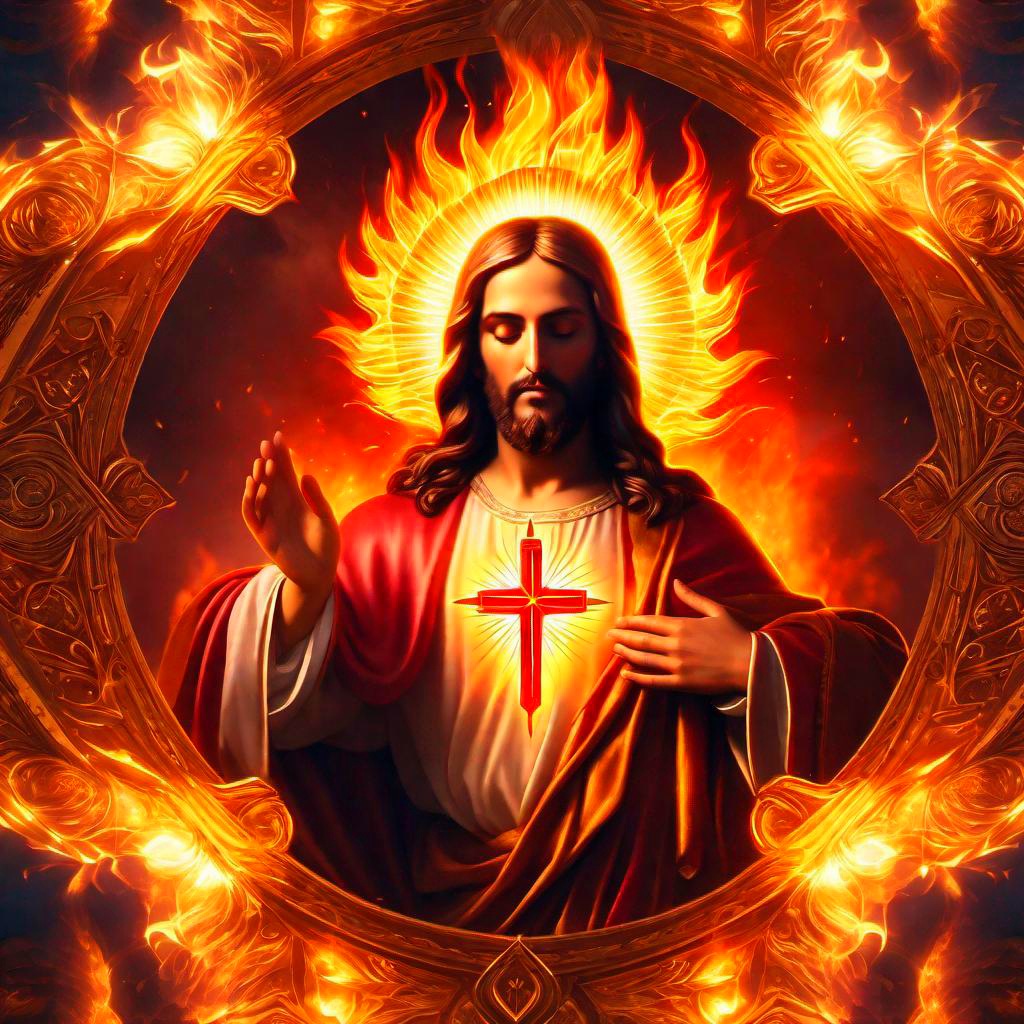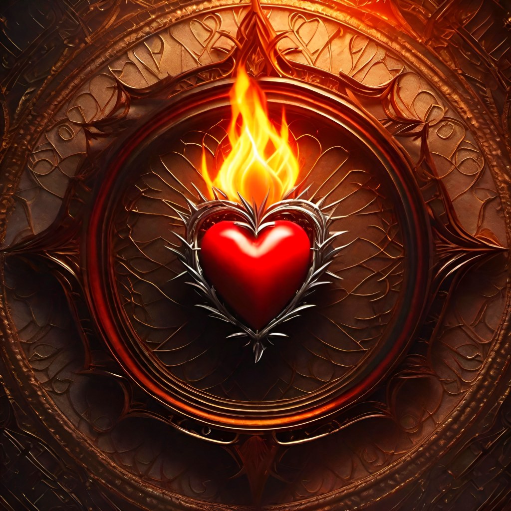 Above the flames is a cross showing that His Love for us was so great that He died for us.