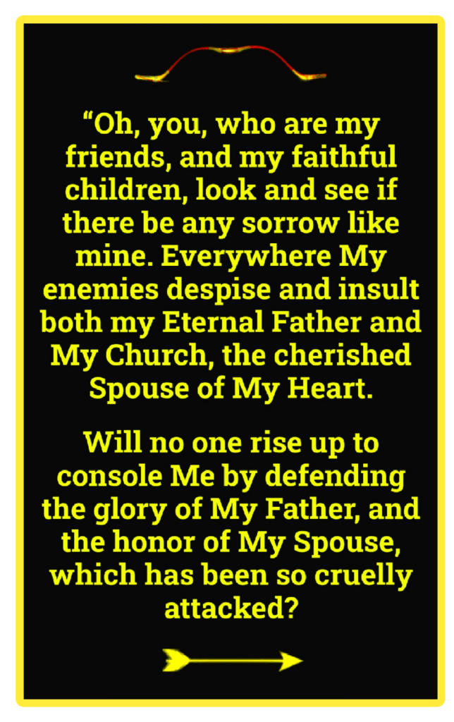 “I have already told you that I hold you in My hands as an arrow. I now want to hurl this arrow against my enemies. To arm you for the battle ahead, I give you the weapons of my Passion, that is My Cross which these enemies dread, and also the other instruments of My tortures. Go forward to meet those foes with the artlessness of a child, and the bravery of a courageous soldier. Receive this mission the benediction of the Father, of the Son, and of the Holy Ghost.”